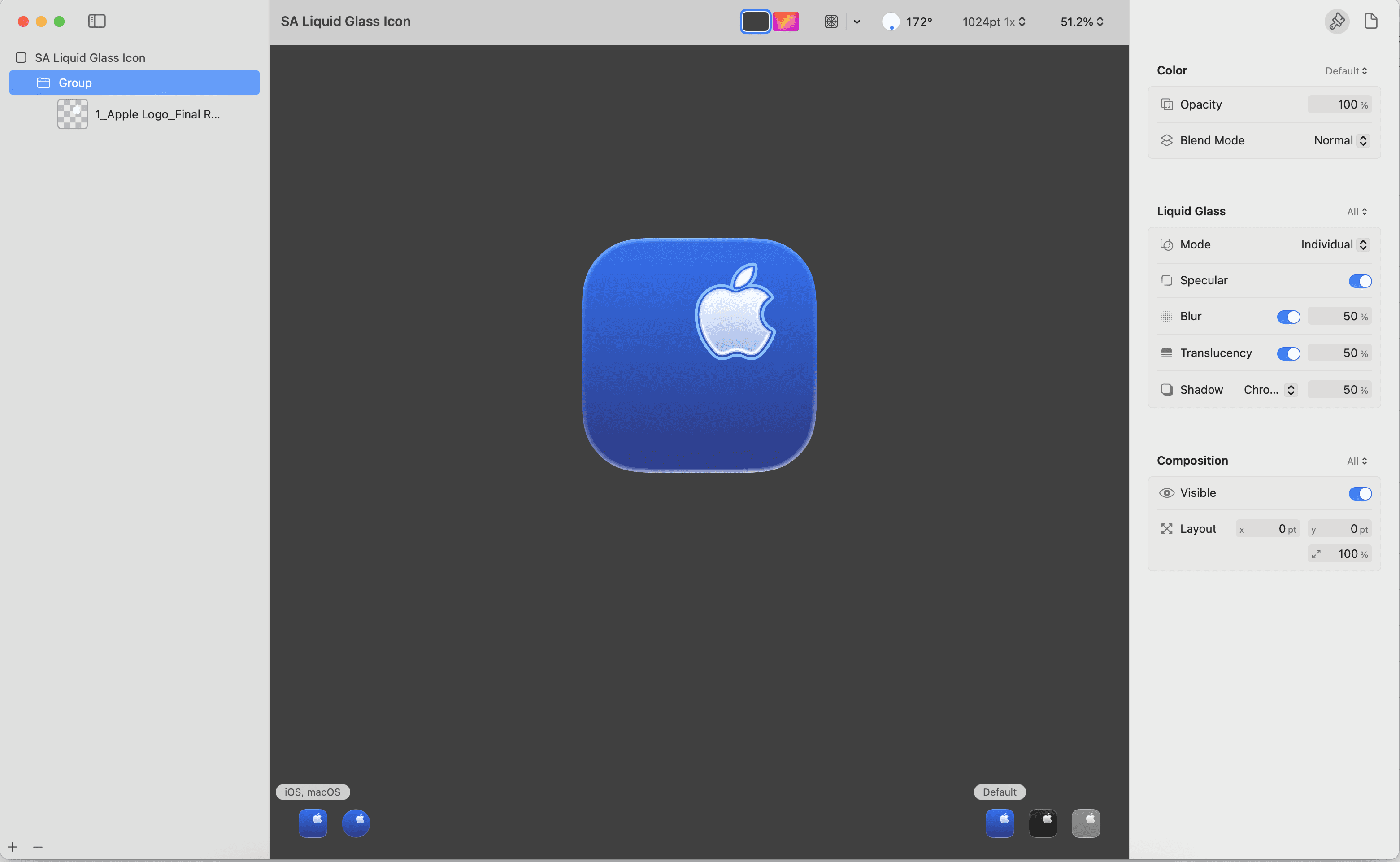 Onto the next. Now that everyone was on board with the alignment and placement of Apple logo within the app icon, it was time to add the Liquid Glass Effect.