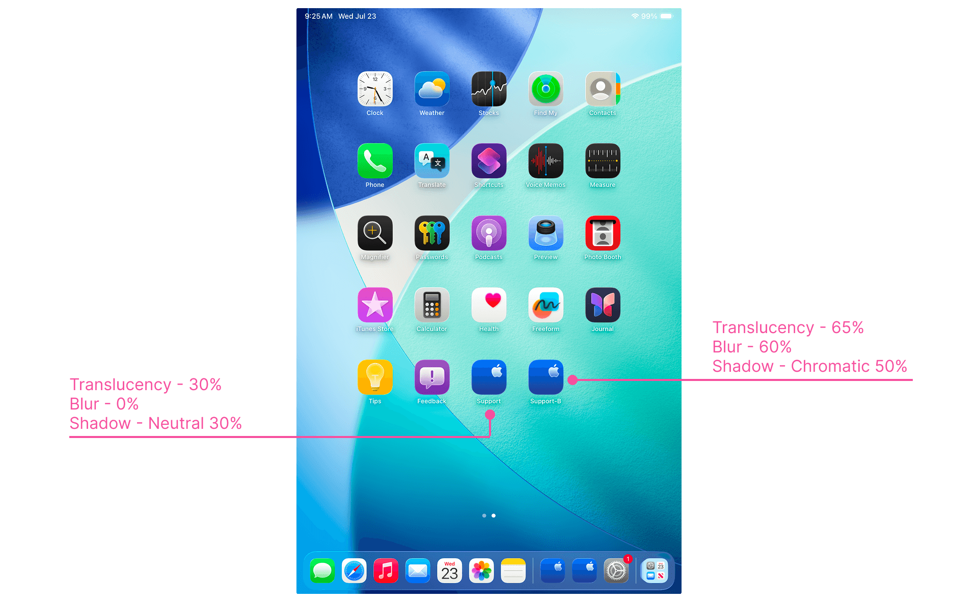 Design Exploration. Based on the observations, I started exploring the liquid glass effect for Support App Icon in the Icon Composer.